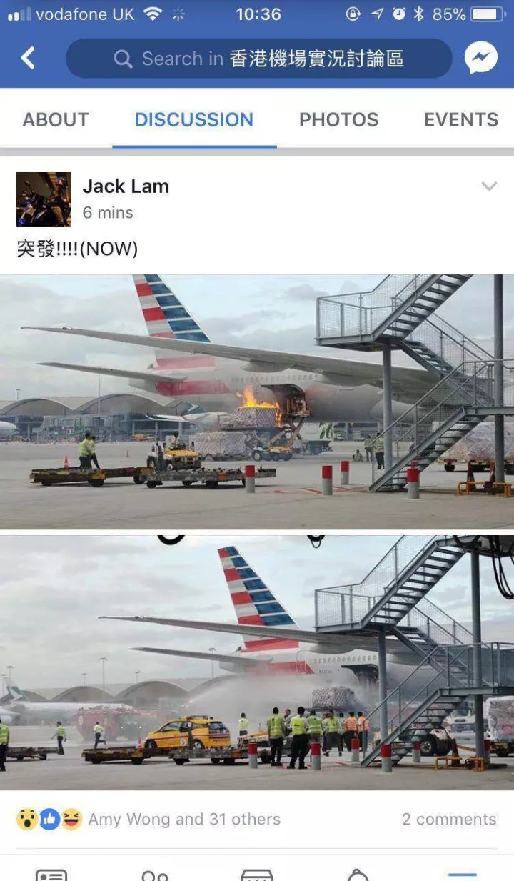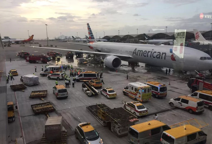 美國航空一班編號AA192客機原定于傍晚6時10分出發(fā)前往美國洛杉磯,至下午5時許于42號停機坪停泊時,近機尾的上貨位置有貨物懷疑起火,火速迅速蔓延,客機亦被波及。火警期間,有職員逃生時不慎墜地受傷。消防接報趕至,迅速將火熄滅,目前起火原因正在調(diào)查中。