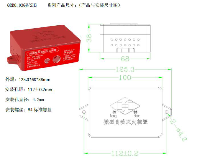 恒神微型熱氣溶膠滅火裝置是由引發(fā)器(電引發(fā)器/火災探測線束)、熱氣溶膠發(fā)生劑和發(fā)生裝置、反饋元件及冷卻外殼等部件組成,無壓力容器、壓力閥等氣動元件,具有效期長,免維護,可靠性高的特點。